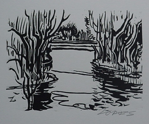 Milford Zornes, Linoleum Block, "Bayou Waters", size: 6" x