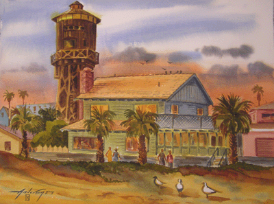 Bill Anderson, watercolor "Sunset Beach Watertower" painted in 2