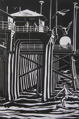 Bill Anderson, Linoleum Cut, "Huntington Beach Pier", Created in