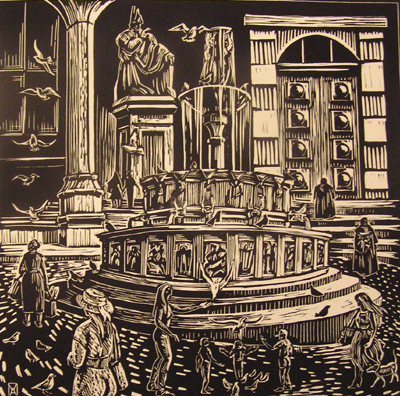 Bill Anderson, Linoleum Block, "Fountain in Perugia", Created in