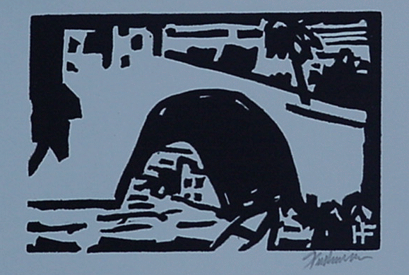 This is an original linoleum cut block print created by Henry Fukuhara. It is signed and numbered in pencil by the arist. Image size 4" x 6". Created in 2005 andit is titled "Venice Bridge".